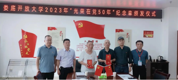 6月30日上午,婁底開放大學組織開展“光榮在黨50年”紀念章頒發儀式,為榮獲“光榮在黨50年”的2名老黨員頒發紀念章。
